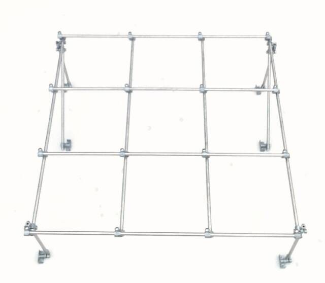 Platform support design (no base support rods), tubular stainless steel rods, zinc alloy connectors and zinc alloy anchors.